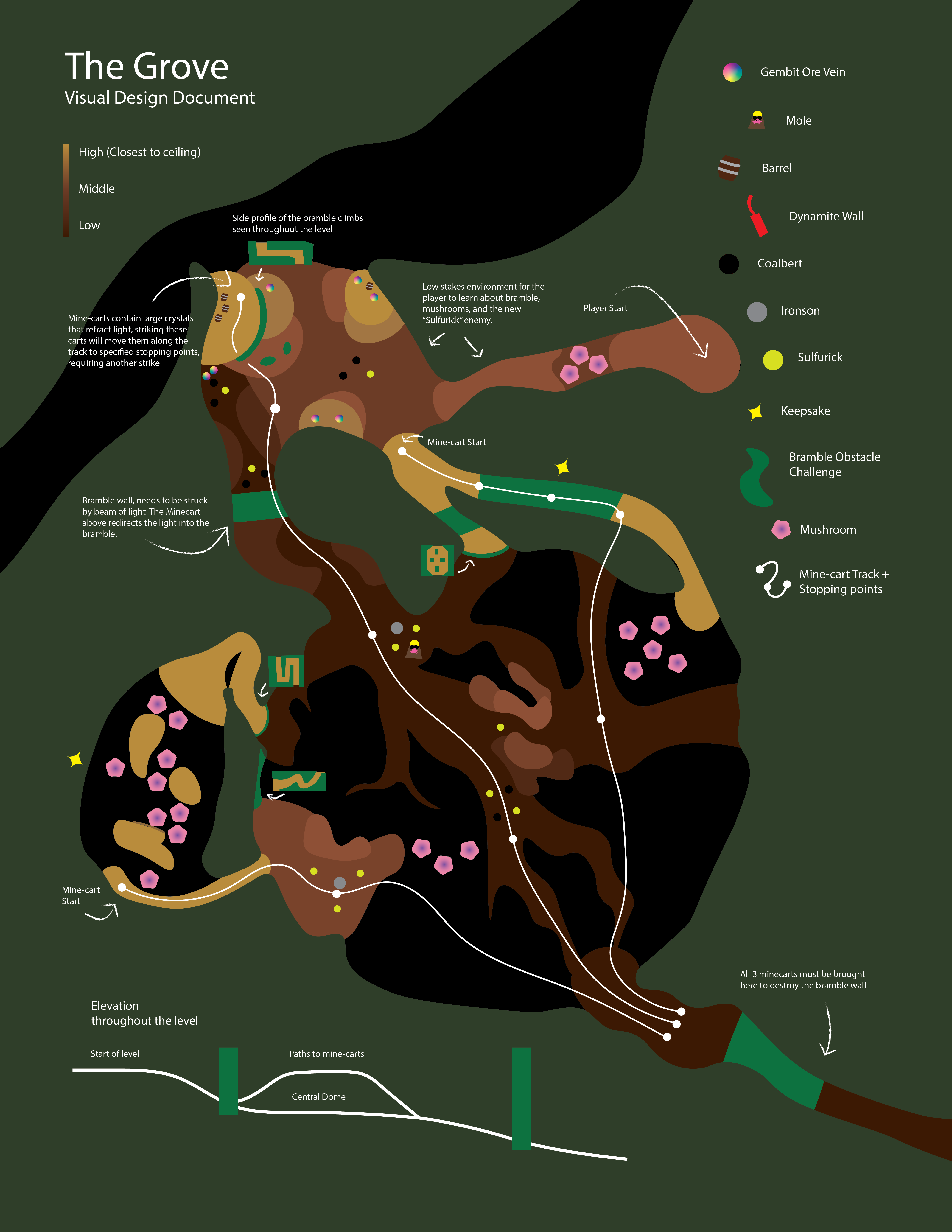 Working alongside Dylan Wilcox to co-create the Grove and the Mantle, I spent an extensive amount of effort to bring the Grove to life. I was responsible for implementing core interactive elements for the level, such as our movable minecart system and the light crystals, which help the player clear bramble and navigate the Grove.